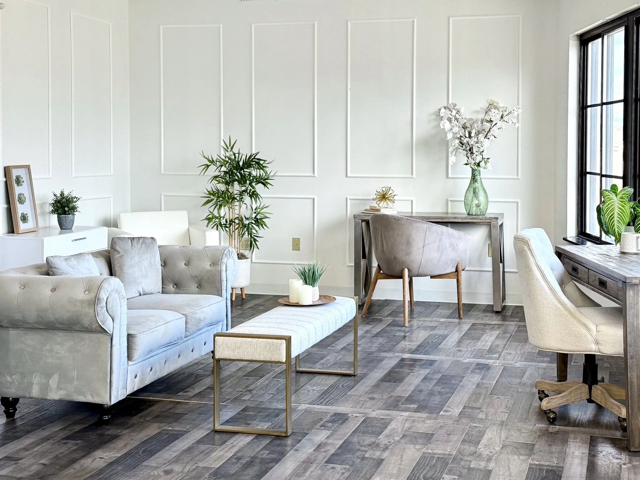 Lilac & Birch Studio has a full wall of beautiful north facing windows for soft, consistent, natural lighting all day. There is also an area in the studio away from the windows that is perfect for studio lighting.